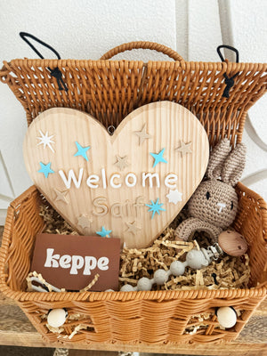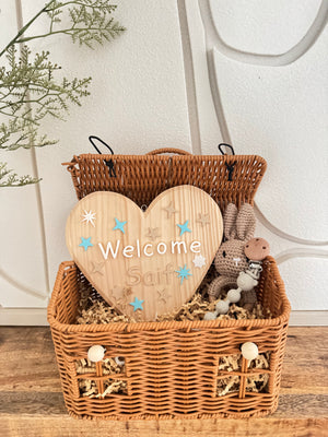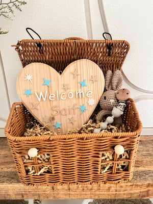This charming basket includes a personalized wooden heart welcome plate, a soft baby rabbit rattle, and a bear pacifier clip, all carefully arranged in a woven house-style basket. This gift is ideal for newborn visits, baby showers, hospital welcomes or as nursery decoration.